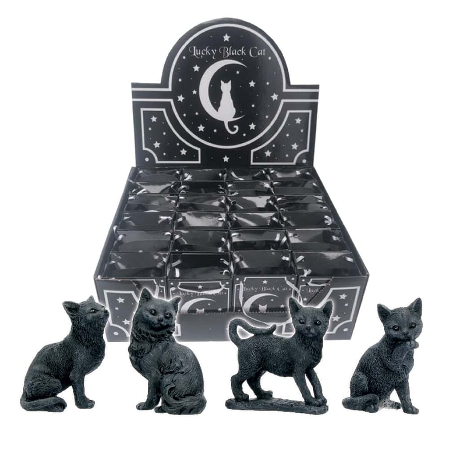 Expositor de mostrador con 24 cajas que contienen una miniatura de resina de 9 cm pintada a mano de un gato negro de la suerte. Los sujetos están surtidos al azar.
